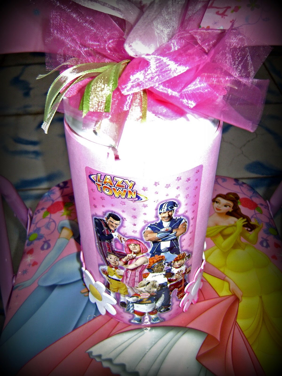 Uno o dos años después opté por la versión mas pequeña. Aquí me esmeré mas con las tapas, que quedaron mas vistosas. La tecnica es la misma solo cambié el personaje y gasté menos $$$ en dulces...