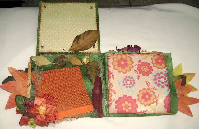 Tengo una variación no otoñal de éste mismo álbum que presentaré mas adelante, pero esta versión me gustó mucho porque pude reciclar mis hojas secas de sachet además de algunas que recojí de mi jardín, y me parece que estoy trabajando algo diferente muy personal, porque son elementos que me gustan mucho....